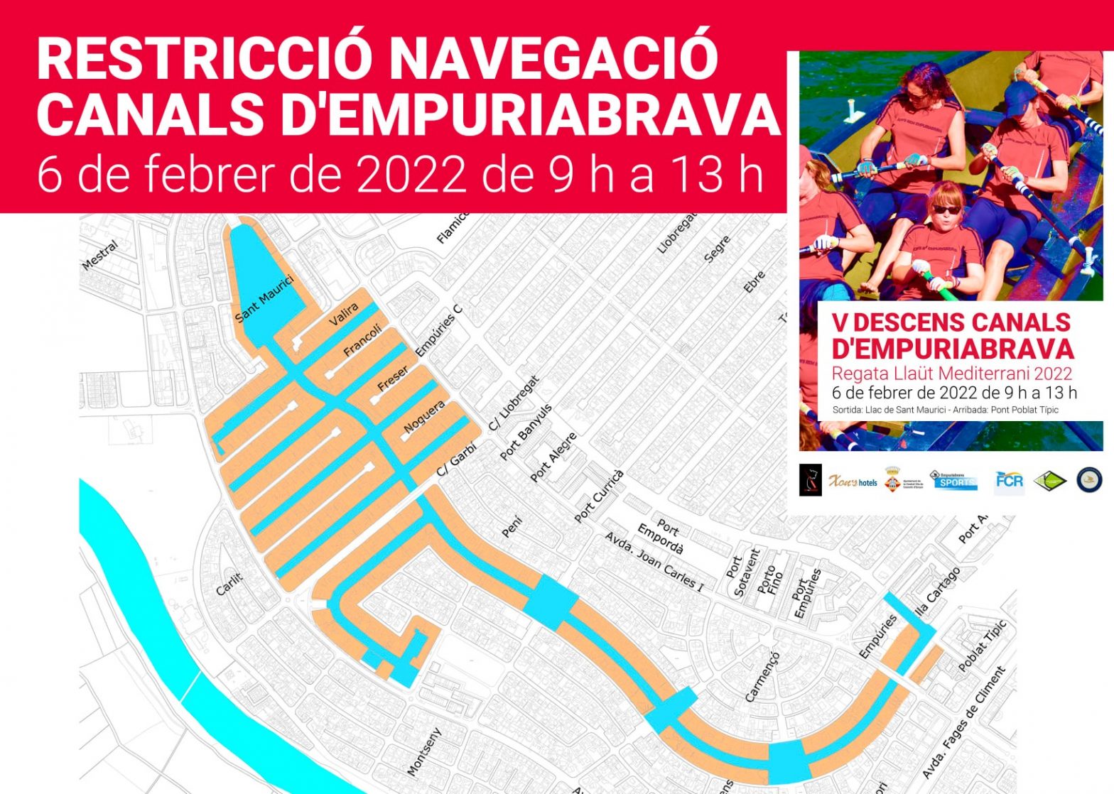 Ajuntament de Castelló d’Empúries informa: Atenció, aquest diumenge 6 de febrer tindrà lloc el V descens pels Canals d’Empuriabrava. Per aquest motiu, la navegació quedarà prohibida de 9 a 13 hores pels canals que es detallen al mapa adjunt. Esperem que gaudiu de l’activitat i disculpeu les molèsties.